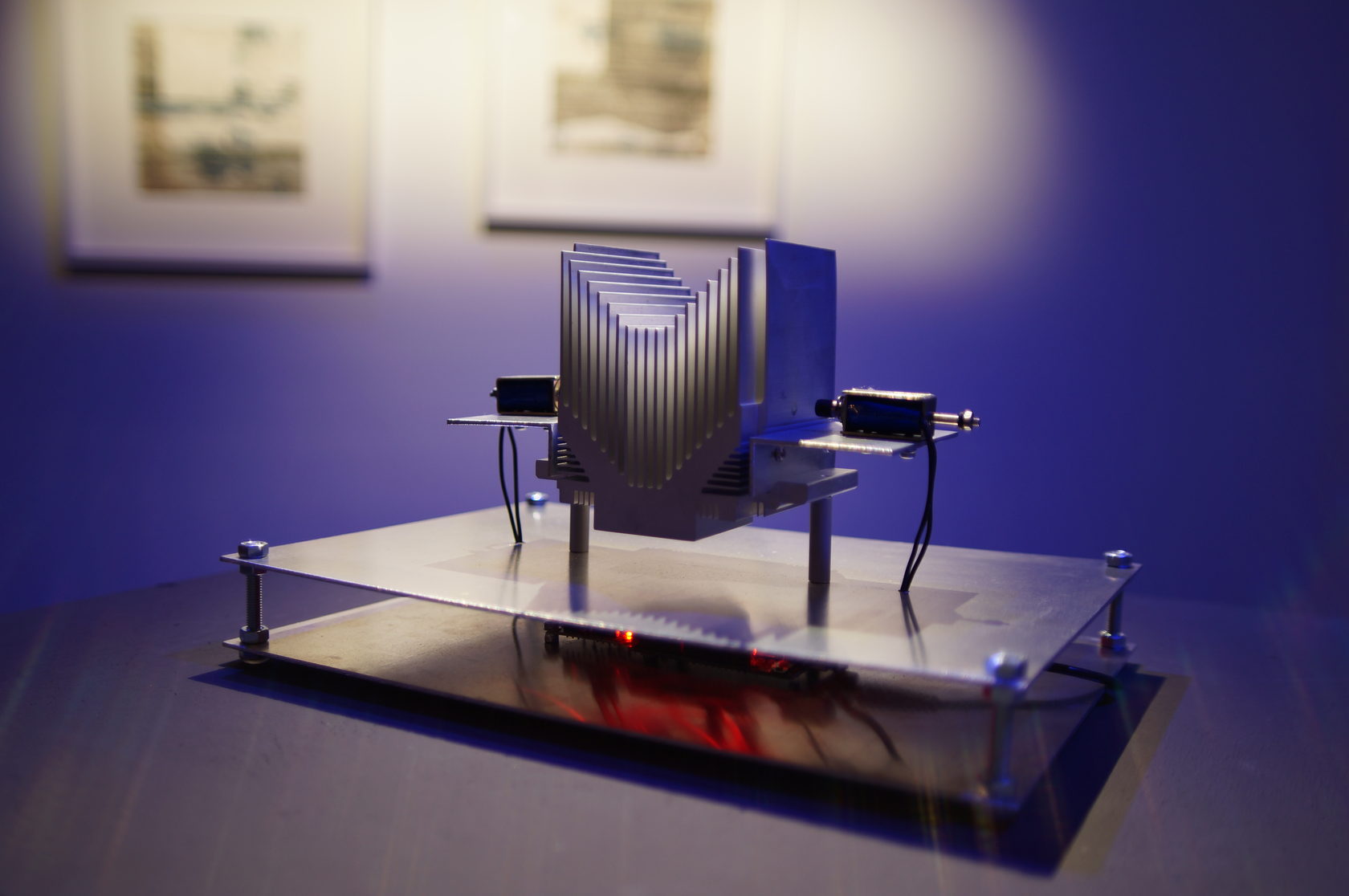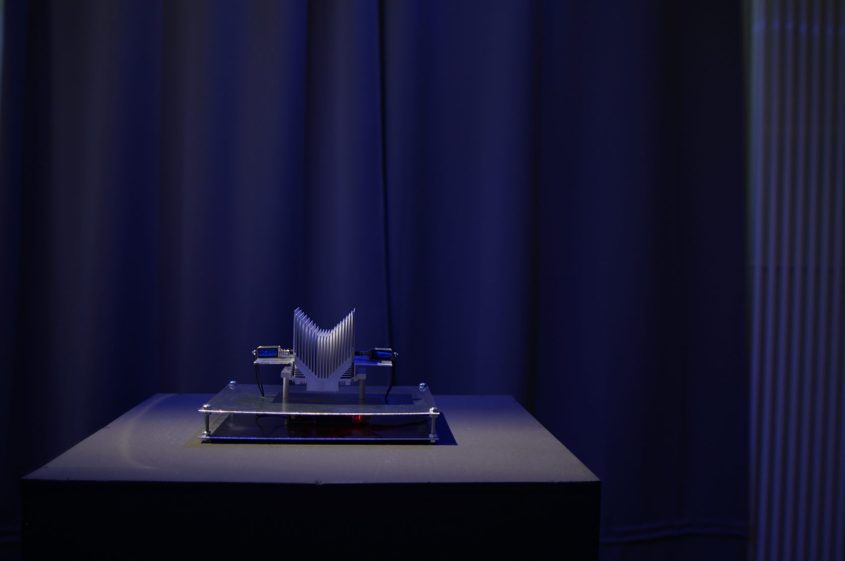 Two solenoids obey the controller commands and create a rhythmic pattern. They make beats on two parallel plates. At this time, 19 auxiliary plates are in resonance at different pitch. The behavior of the solenoids is given a random principle.